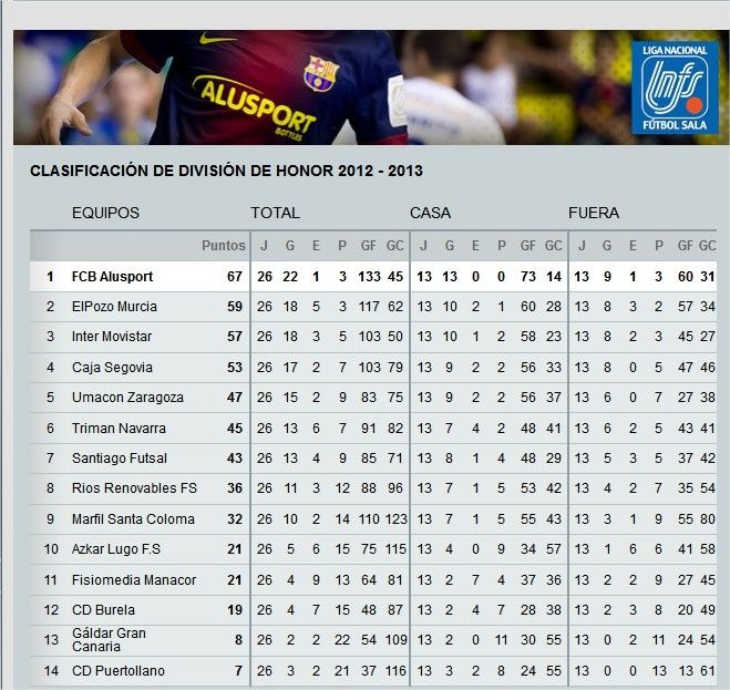 Futsal : Classement final de la Liga LNFS (Saison régulière).